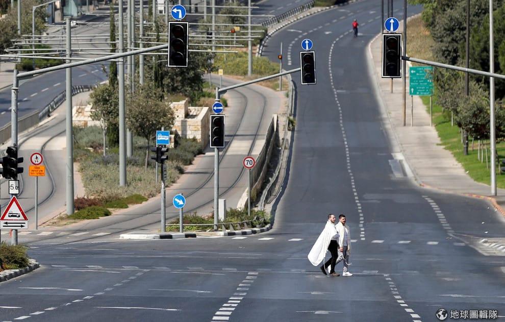在耶路撒冷(Jerusalem),兩名猶太教信徒走過了空蕩蕩的街道。時逢猶太人最重要的節日「贖罪日」(Yom Kippur),大部分的以色列猶太人會接下來 25個小時禁食、不開車。