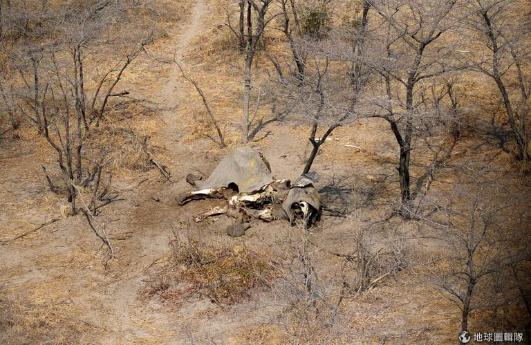 在這張空拍圖中,紀錄下一具死去大象的遺骸。這一陣子,保育團體「大象無國界」(Elephants Without Borders)和「艾倫家庭基金會」(Paul G. Allen Family Foundation)在非洲地區進行大象普查(Great Elephant Census),並發現在這 3個月內,波札那一共有 87隻大象遭到盜獵者殺害。
