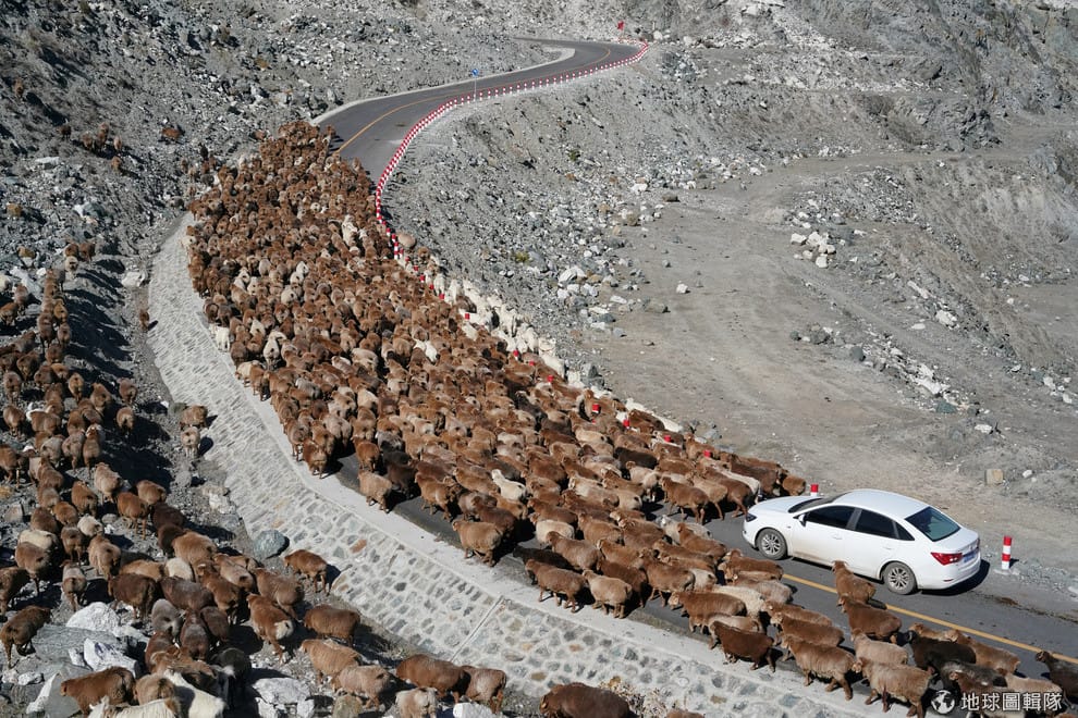 在中國新疆的可可托海鎮,羊群們正在進行季節遷徙。