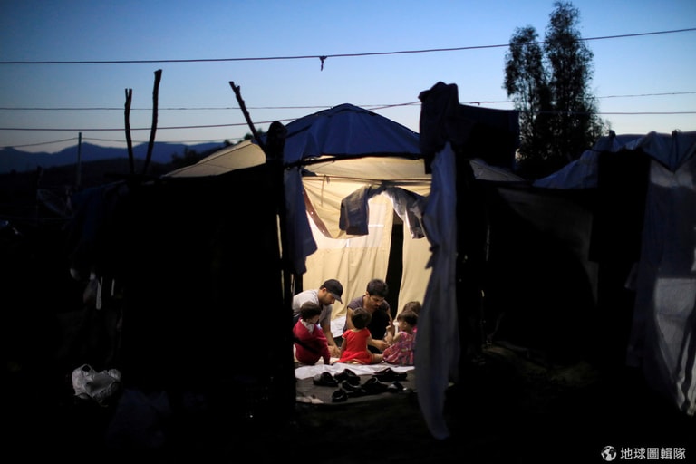 在列斯伏斯島(Lesbos)臨時搭建的庇護所裡,2名移民、4名孩童準備在帳棚裡度過夜晚。