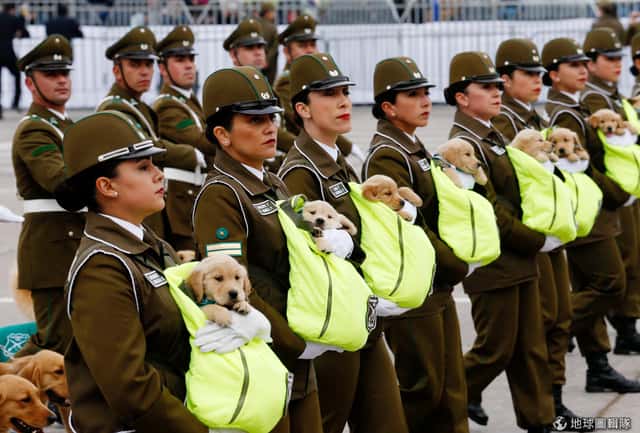 在一年一度的軍事遊行上,警察們抱著未來會成為警用犬的狗狗一同走上街頭。