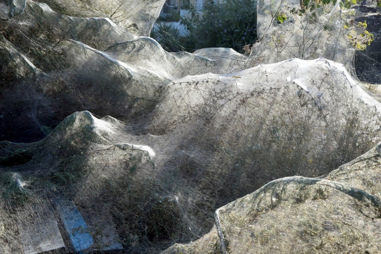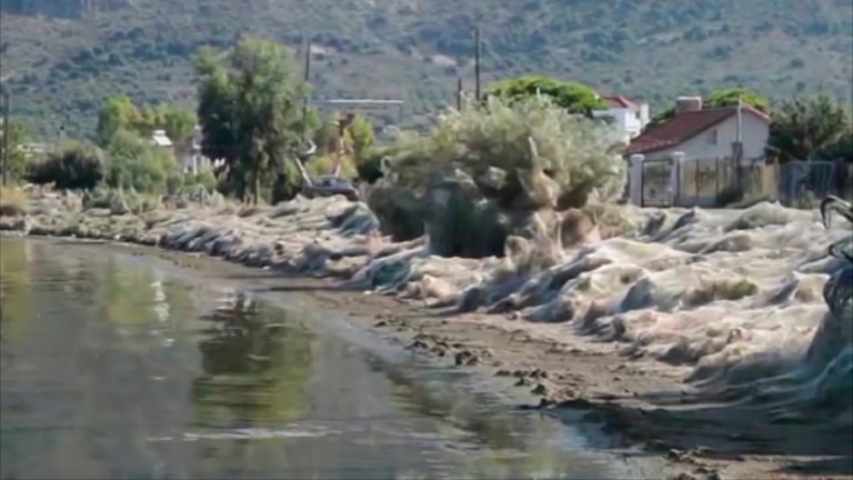 這一陣子,希臘西部城鎮艾托利科(Aitoliko)出現了不太一樣的景致:峰峰連連到天邊、大概蔓延了 300公尺的高密度蜘蛛網。