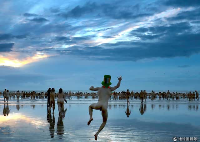 在英國北海卓洛里卓海灣(Druridge Bay),面對一年一度的年度裸泳活動(North East Skinny Dip),上百名參加者興奮地朝大海奔去。