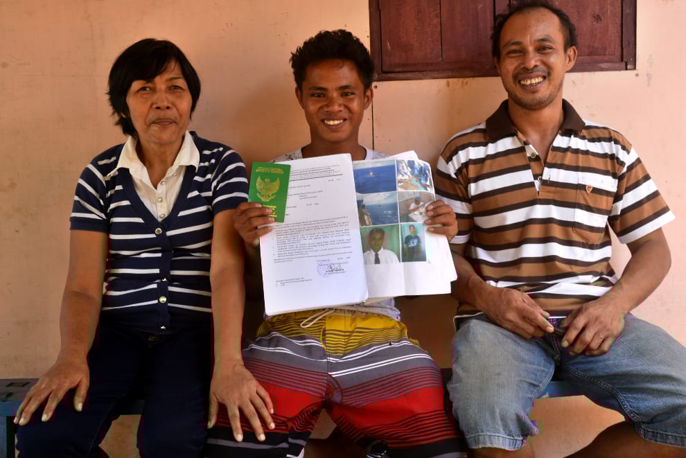 在海上漂泊 49天後,回到家的阿爾迪開心拿出身份文件,和父母一同合照。