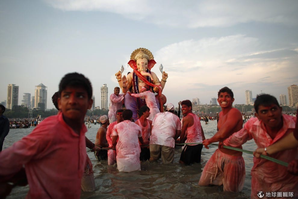 在 2012年的象神節,印度教信徒準備把象神(Ganesh)的雕像抬入河裡。