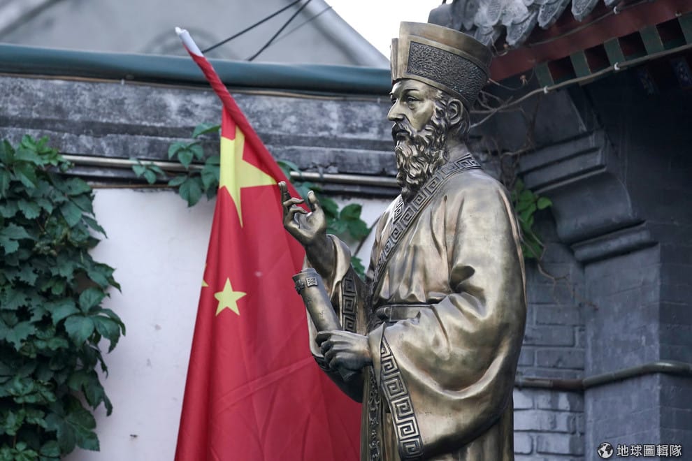 在北京宣武門天主堂的意大利傳教士利瑪竇(Jesuit Matteo Ricci)雕像後,擺著一面中國五星旗。近日,梵諦岡和中國政府達成協議,羅馬天主教宗方濟各(Pope Francis)承認了由中國當局任命的七名主教的正當性,中國當局也透過這項協議,首次承認了教宗對中國天主教徒的權威,雙方多年來的權力之爭可望透過這項協議降低衝突。