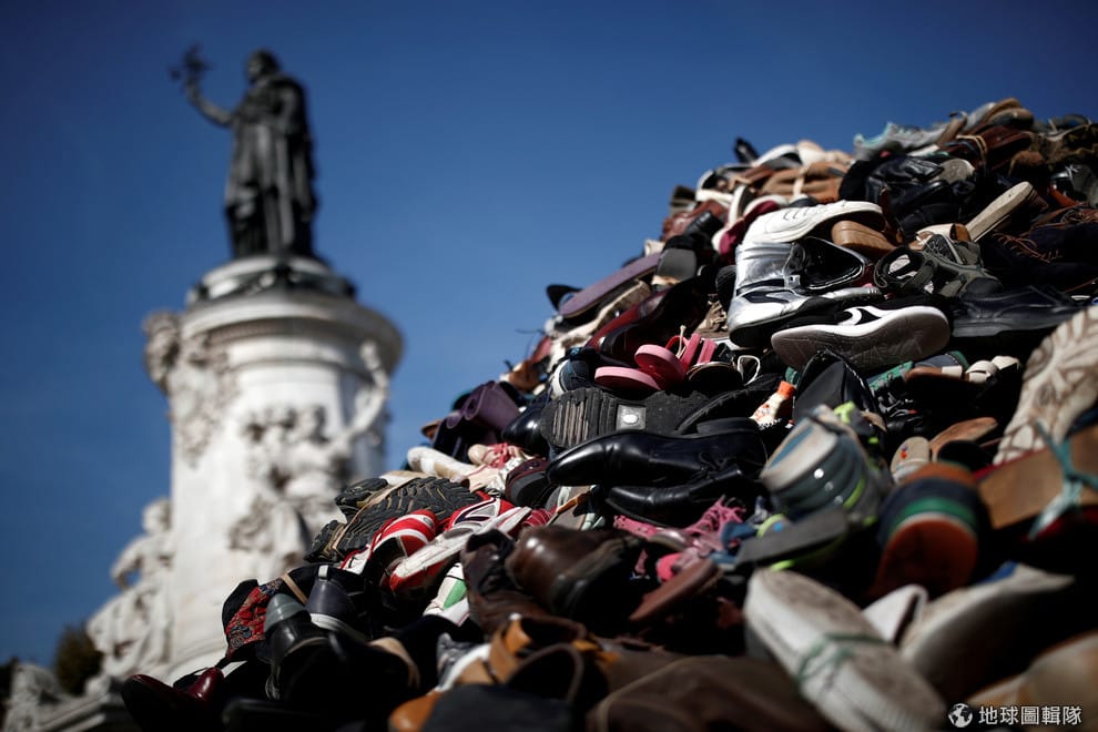 在巴黎共和國廣場前,國際傷殘組織(Handicap International)的工作人員堆起了一雙雙鞋子,藉此譴責使用和販賣傷人地雷的無良人士。