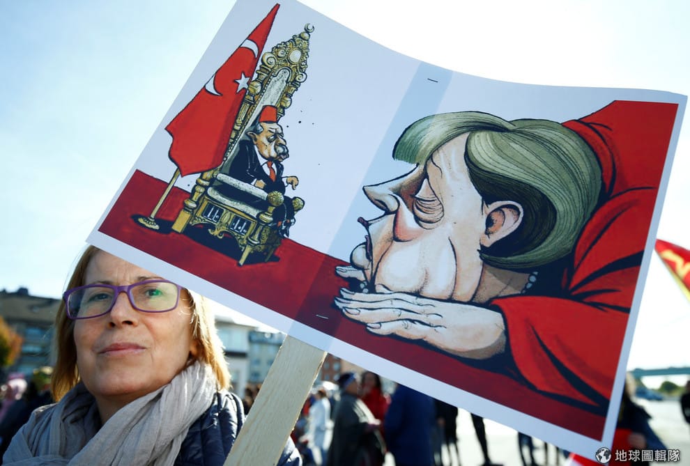 在科隆中央清真寺即將正式啟用前夕,反對者舉著一張德國總理梅克爾(Angela Merkel)對土耳其總統埃爾多安(Tayyip Erdogan)俯首稱臣的海報,諷刺德國對土耳其的讓步。目前,德國大約住有 300萬名土耳其裔德國人。