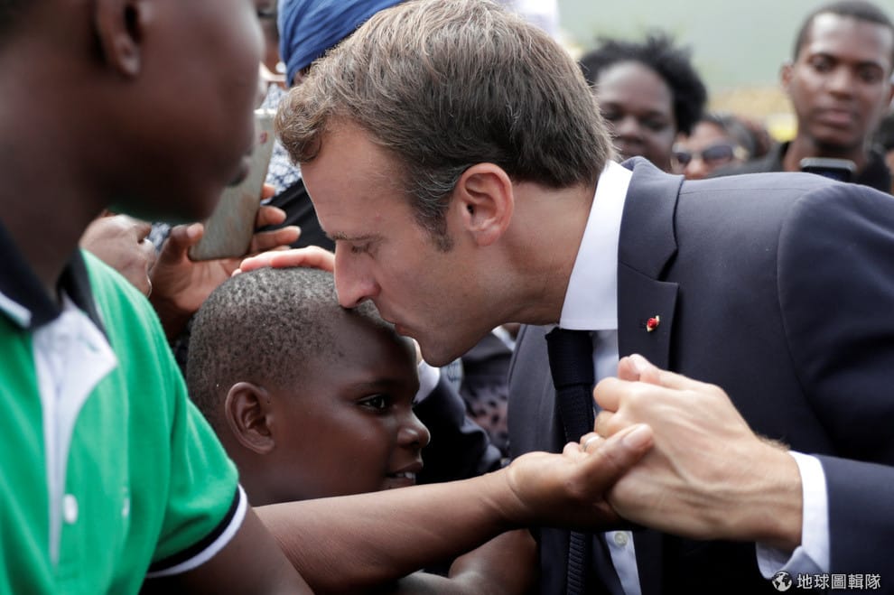 在位於加勒比海上的聖馬丁島(Saint-Martin)法屬海外行政區,法國總統馬克宏(Emmanuel Macron)低頭給了小男孩一個吻,這座島在一年前曾遭到颶風艾瑪(Hurricane Irma)破壞,目前正在重建。