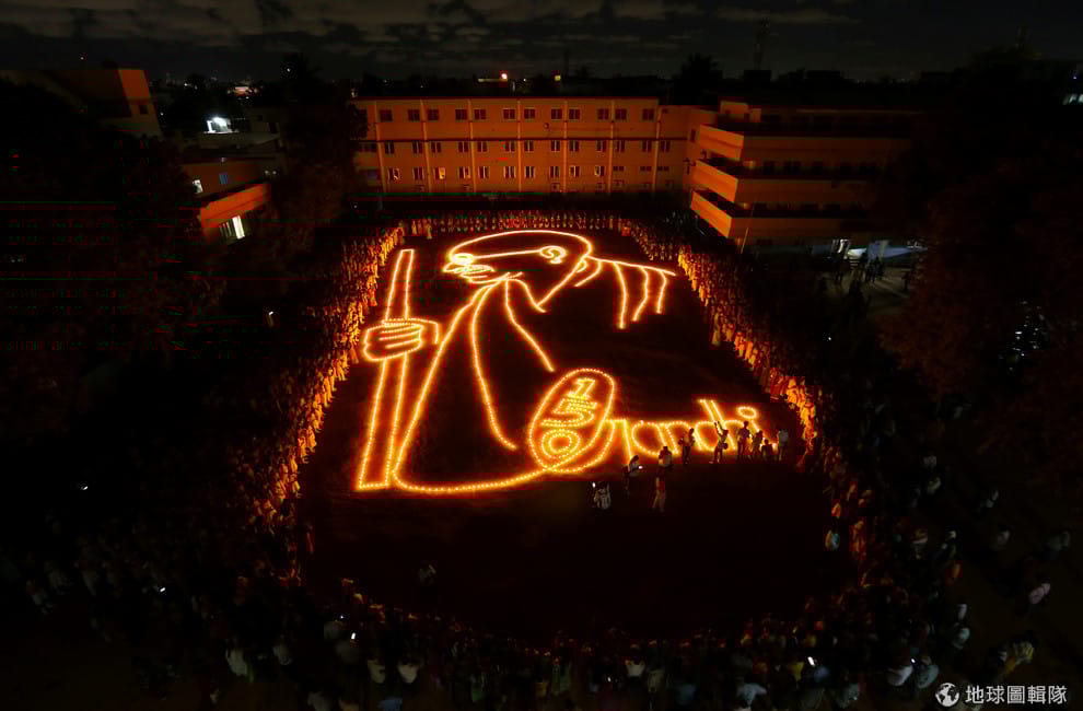 在印度聖雄甘地(Mahatma Gandhi)150歲冥誕的這一天,欽奈市(Chennai)的師生用LED蠟燭排出甘地的圖像來紀念他對印度的貢獻。