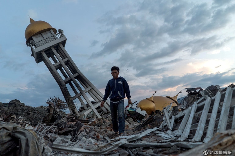 在蘇拉威西島(Sulawesi)的帕盧市(Palu),一名男子走在被大地震震毀的廢墟中。