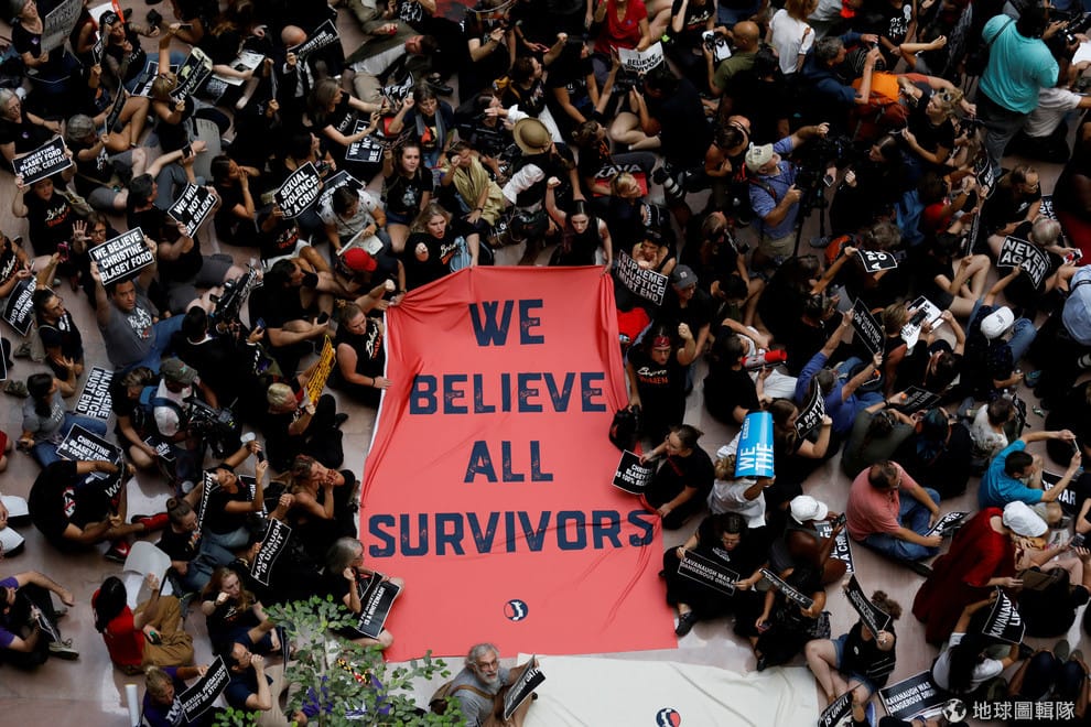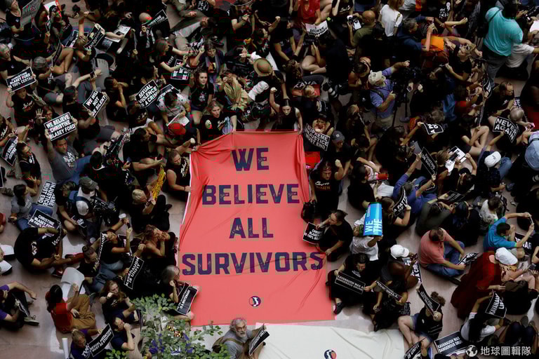在華盛頓國會山莊的參議院大樓內,抗議美國總統川普(Donald Trump)提名卡瓦諾(Brett Kavanaugh)為大法官候選人的民眾靜坐示威,拉起印有「我們相信所有倖存者」字樣的紅色布條,支持勇敢站出來指控卡瓦諾企圖性侵她的美國帕羅奧圖大學心理學教授福特(Christine Blasey Ford)。