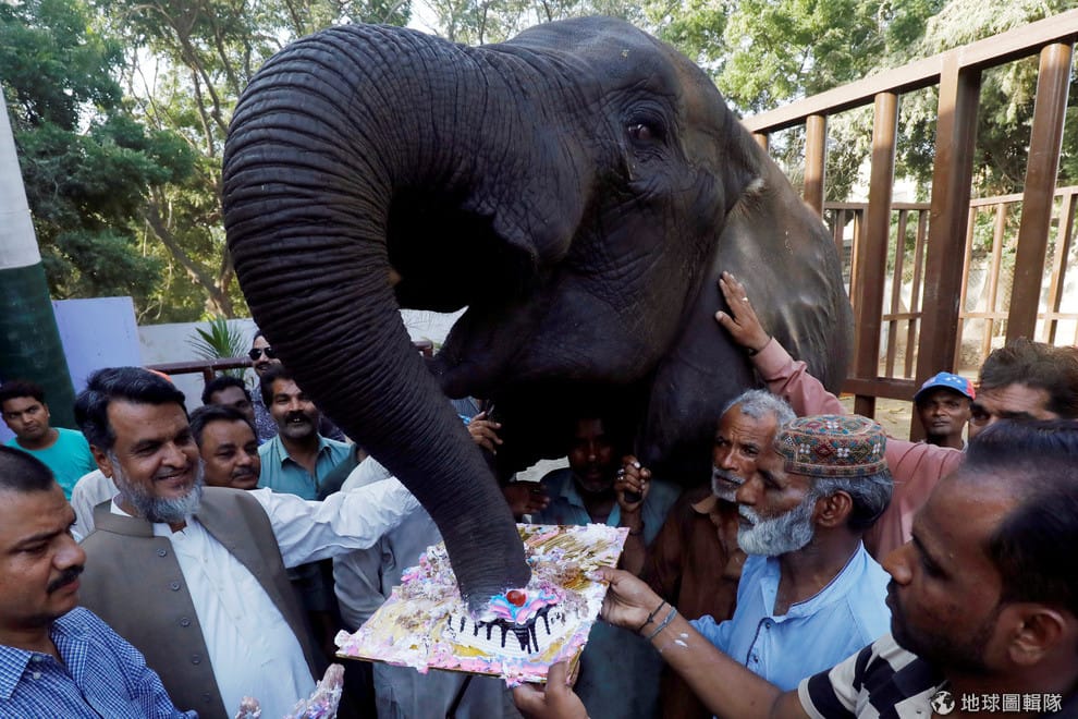在巴基斯坦第一大城喀拉蚩(Karachi)的動物園,大家七手八腳地替今年滿 14歲的大象努爾(Noor Jahan)慶生。