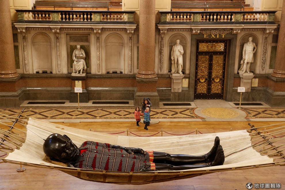 在利物浦的聖喬治大廳,法國劇團Royal de Luxe展出了一尊睡在吊床上的巨大小男孩雕像。