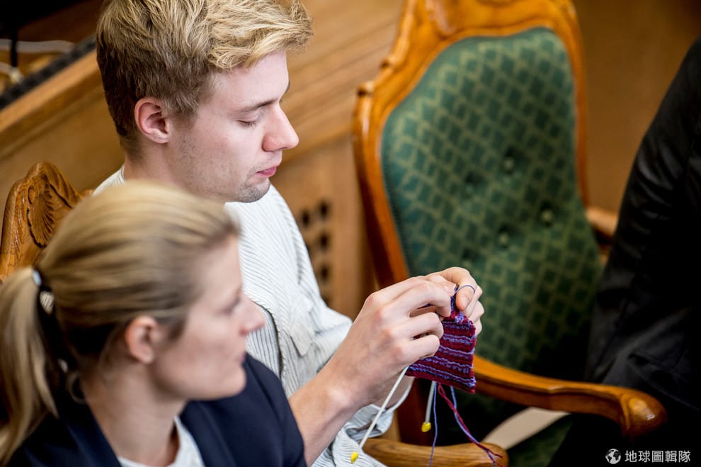 來自團結名單─紅綠聯盟政黨(Red-Green Alliance)的國會議員維斯塔貢(Rasmus Vestergaard)一邊打毛線,一邊聽國會議程的開場辯論。