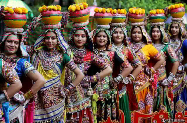 在印度第七大城艾哈邁達巴德(Ahmedabad),表演者們穿著傳統服裝,正在為聖母節(Navratri)進行民俗舞蹈Garba的彩排。聖母節是為了敬奉印度教女神杜嘉(Durga)而舉辦的九日慶典。