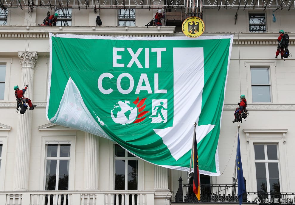 8號這天,綠色和平組織的成員從空中垂降到駐倫敦的德國大使館外,在外牆掛上反對採礦的抗議布條,反對德國近來準備開放在森林附近開採煤礦,影響當地生態。