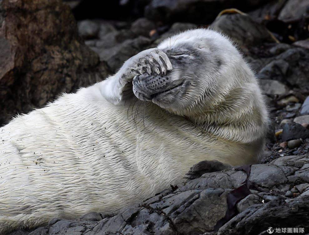 在威爾斯彭布羅克郡(Pembrokeshire)的Martin’s Haven海灣,一隻小海豹躺在岩石上,牠因為還未滿四周所以還沒有開始換毛,身上還是不防水的白色皮毛。