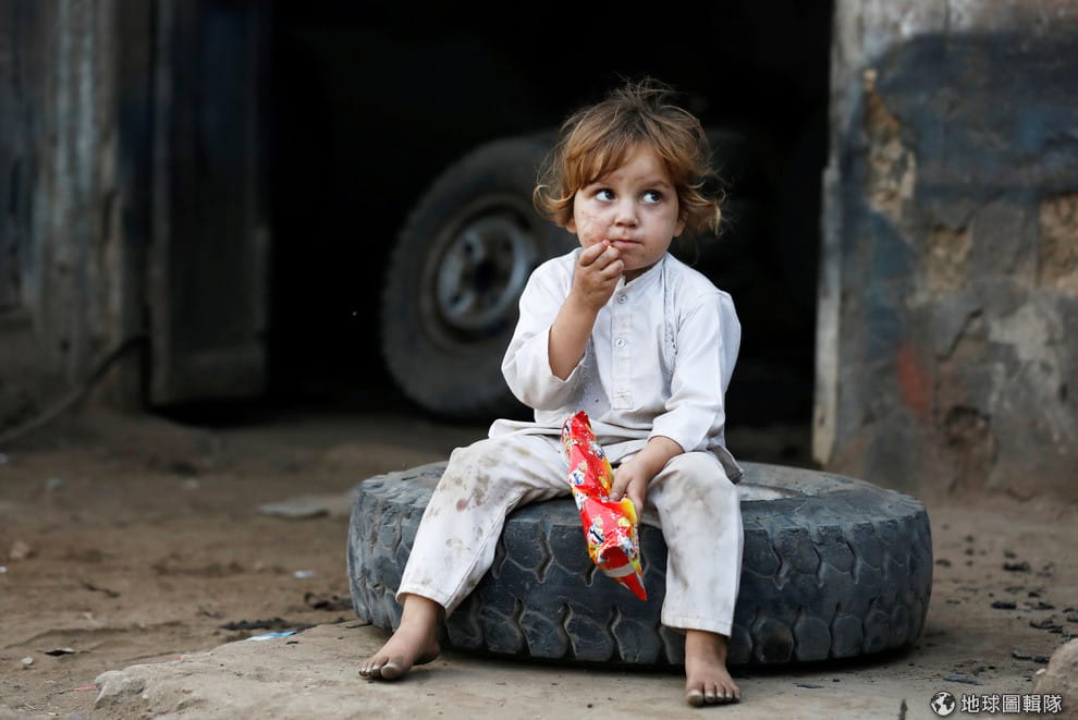 在巴基斯坦第一大城喀拉蚩(Karachi),一名小女孩坐在輪胎上自顧自地享受手上的美食。