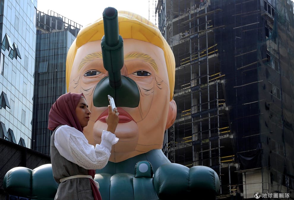 在首都貝魯特(Beirut),一名女子走過了化名藝術家「騙子聖徒」(Saint Hoax)的藝術展覽「紀念碑」(MonuMental)。畫面中的展品為安裝上坦克鼻子的美國總統川普(Donald Trump)。