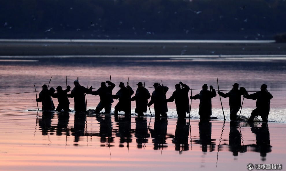 漁夫們張起漁網,準備開始捕鯉魚作業。他們會先把大量的鯉魚困在網子裡,再從中挑選合適的鯉魚。