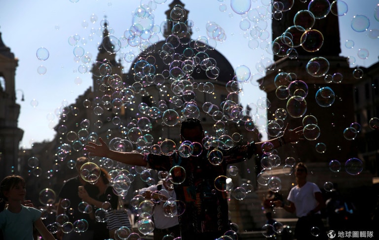 在羅馬市中心,一名男子正在和成堆的泡泡玩耍。