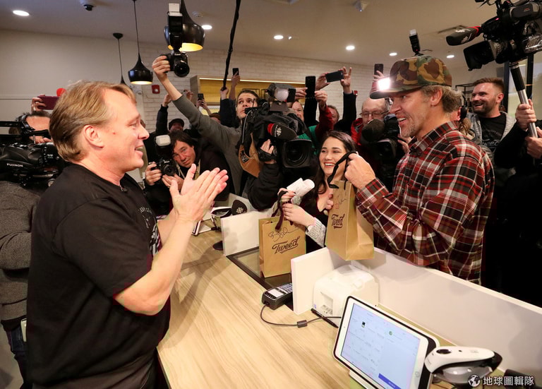 在鎂光燈的聚焦下,大麻企業Canopy Growth執行長林頓(Bruce Linton)賣出店裡第一份休閒用大麻。