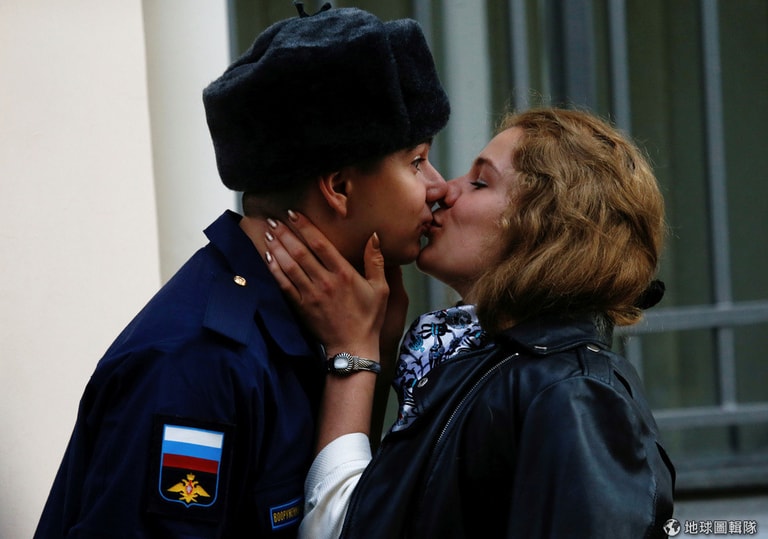面對俄國新兵即將前往新訓中心,一對情侶抓準時機給彼此一吻。