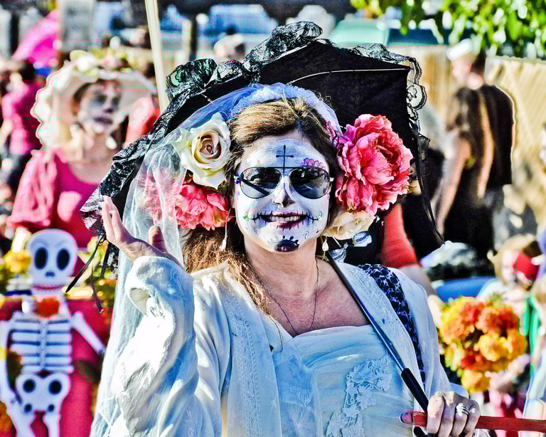 吃飽喝足後,不少人會到大街上參加亡靈節大遊行,他們會扮成一具具骷髏,將臉彩繪成骷髏頭的模樣。而這些裝扮中,最著名的要屬穿著華麗禮服的「卡翠娜骷髏頭」(La Calavera Catrina)扮相了。