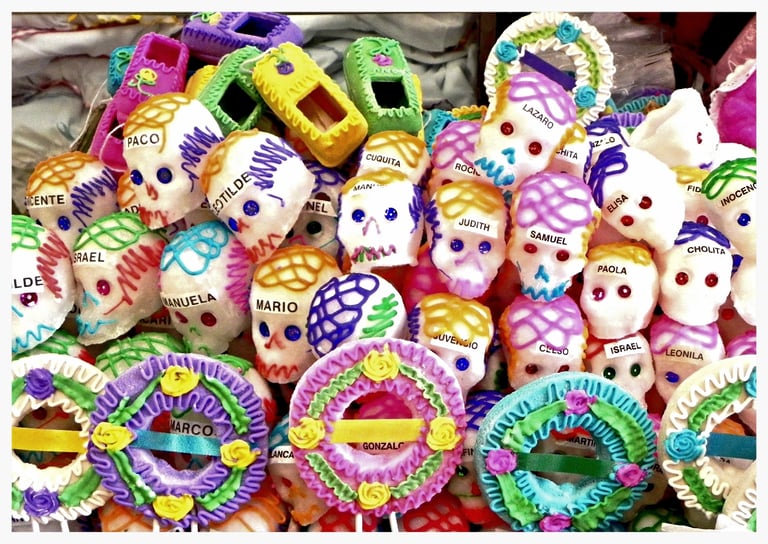 而說到骷髏頭,就不能不提到亡靈節必吃的另一樣食物──「骷髏頭糖」,這種糖果的出現與 17世紀的義大利傳教士帶來的糖藝傳統息息相關,人們把甜滋滋的糖漿倒入骷髏頭造型的模具,接下來等糖漿冷卻脫模後,再加上象徵生命活力、色彩繽紛的裝飾就大功告成了。有的「骷髏頭糖」上還會用彩糖寫上亡者的名字,放在祭壇歡迎亡者回家。