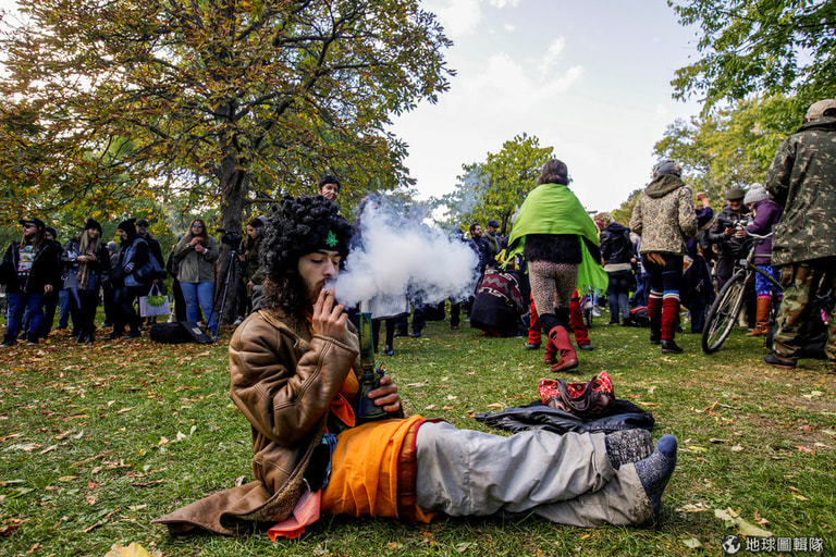 面對加拿大正式讓大麻合法化,在城市多倫多(Toronto)的聖三一貝爾伍德公園裡,一名男子正在用水煙壺抽大麻。