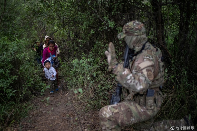 在美墨邊境地帶,一名美國邊境巡防員攔下了非法跨越邊境的移民家庭。