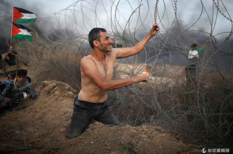 在加薩走廊,一名行動不便的示威者試圖剪掉以色列設下的圍籬。示威者希望以色列政府可以解除對加薩走廊的封鎖,也希望可以要回他們過去被以色列奪走的土地。