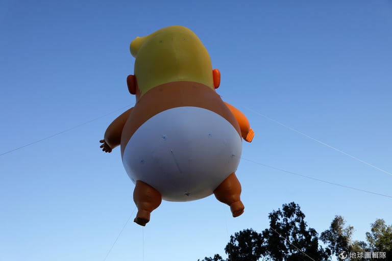 這顆氣球第一次亮相是在英國倫敦(London),現在則輾轉來到了美國洛杉磯(Los Angeles)。它橘色的皮膚、金色的頭髮、手上拿著可以發Twitter的手機,讓人一眼就能認出是美國總統川普(Donald Trump)。