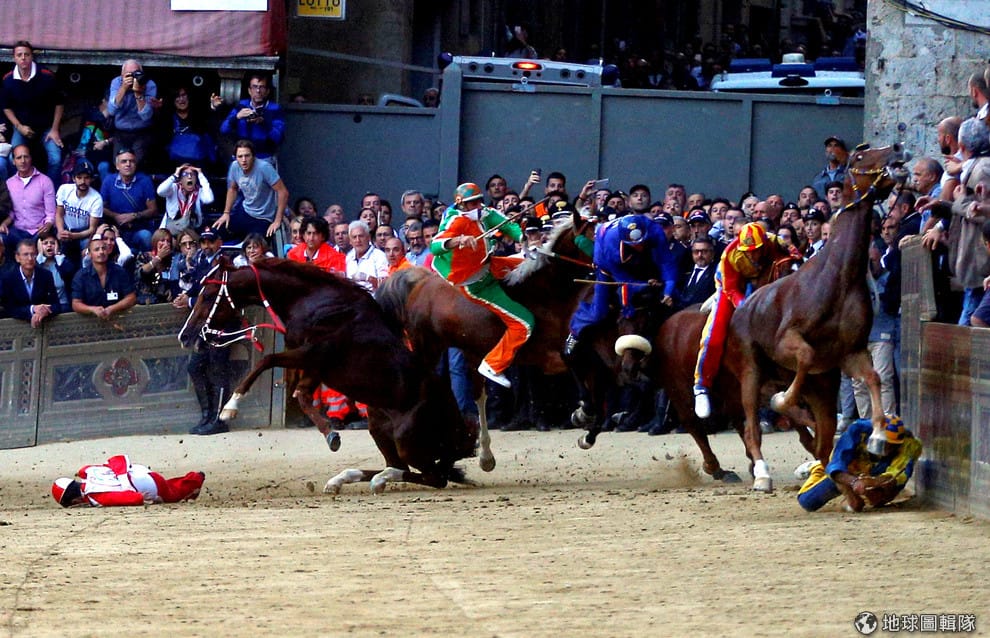 在錫耶納賽馬節(Palio di Siena)上,數名沒有裝備的騎手狼狽地從馬上跌了下來。