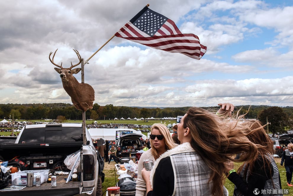 帶上鹿頭和美國旗子的擺飾,人們正在紐澤西州(New Jersey)一年一度的費爾山賽馬節(Far Hills Race Day)開心暢飲。