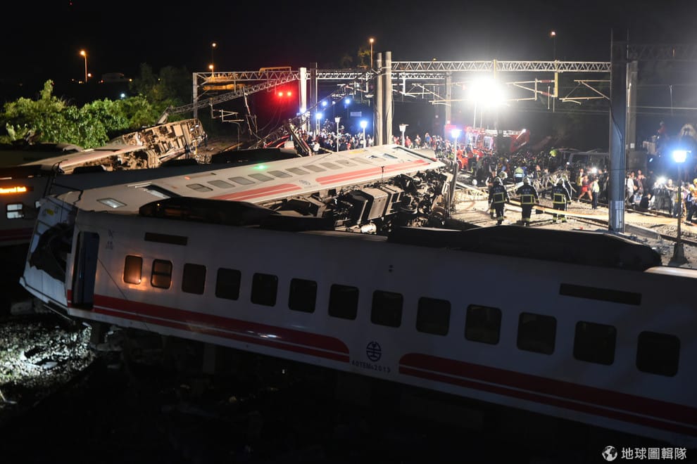 在宜蘭縣,救難人員忙著在出軌的列車旁進行搜索作業。