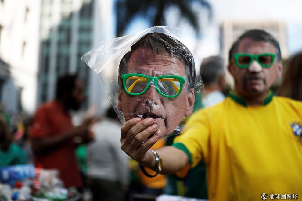 在聖保羅(Sao Paulo)街頭,一名小販正兜售巴西極右翼總統候選人波梭奈羅(Jair Bolsonaro)的面具。