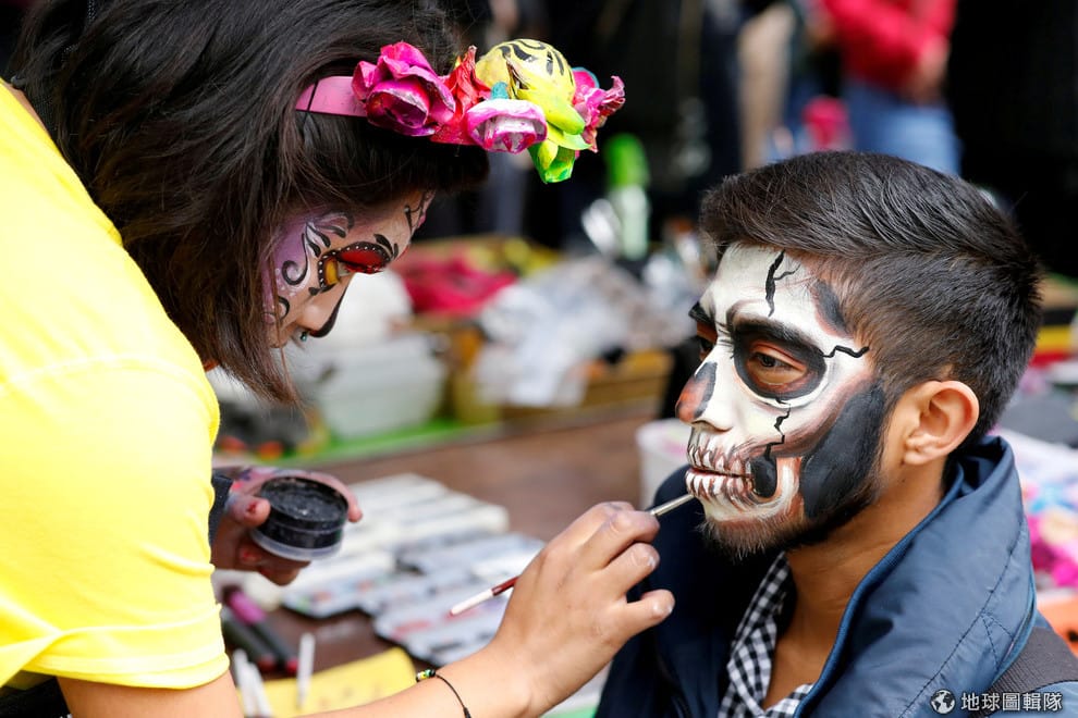 一名男子在臉上化起卡翠娜骷髏(Catrina)的妝容,準備去參加為亡靈節舉辦的遊行活動。