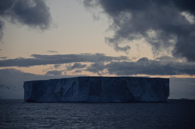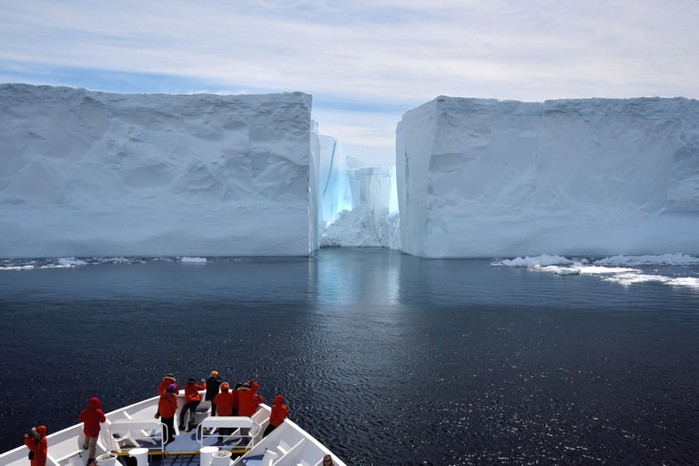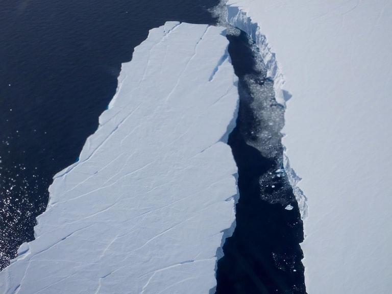 當溫度比冰塊還高的融水進到冰棚冰塊內的裂縫中,會讓裂縫越來越寬與深,最後就會沿著這些裂縫裂成一座座桌狀冰山,所以桌狀冰山的邊緣才會很整齊。