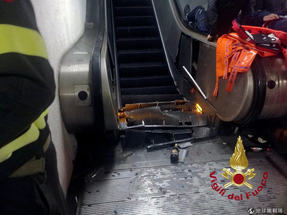23號晚間,羅馬地鐵站的電扶梯發生失速意外,導致乘客宛如人球一般在電扶梯底端卡成一團,總共造成 24人受傷,事故發生當時可怕的場景也被拍了下來。