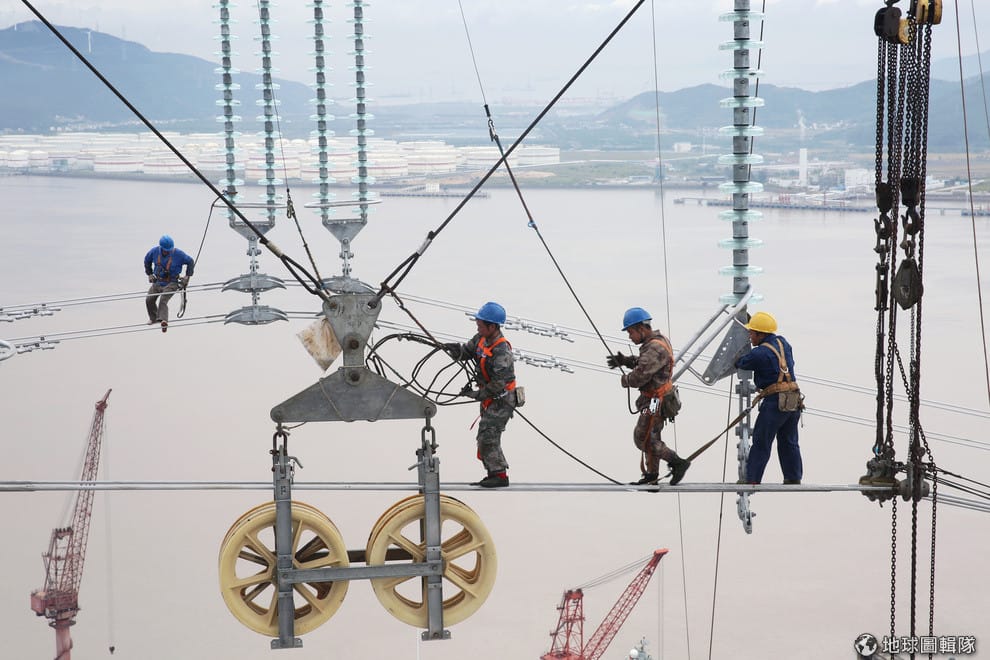 在舟山市,幾名工人在輸電塔上工作中。
