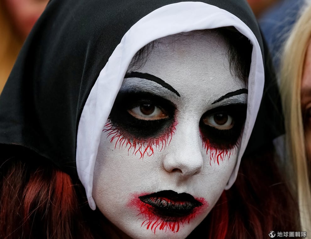 在首都基輔,一名女子打扮成鬼修女的樣子,前來參加一年一度的殭屍大遊行。