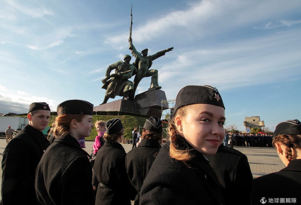在位於克里米亞半島的塞瓦斯托波爾(Sevastopol)港灣城市,俄國青年軍站在軍人與水手紀念碑前宣誓成為青年軍的一員。