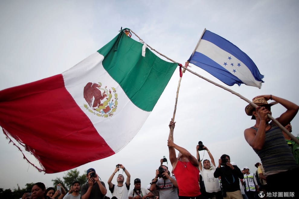 來自宏都拉斯的移民高舉墨西哥和宏都拉斯的國旗,沿著高速公路跟著「車隊移民」(Migrant Caravan)一塊往美國的方向前進,希望到美國申請庇護展開新生活。