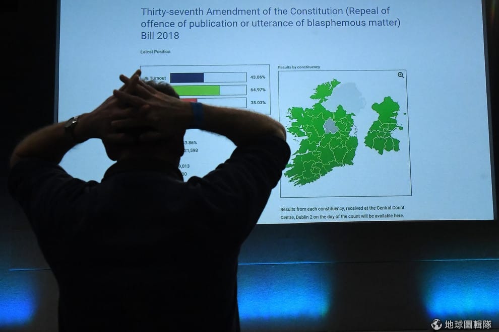 一名男子看著銀幕上出現的修憲公投結果。27號這天,愛爾蘭舉行了公投詢問民眾是否支持將憲法中褻瀆神明罪的相關法律給刪除,結果顯示有三分之二的選民支持。過去,在以天主教信仰為大宗的愛爾蘭,發表或談論對任何宗教不敬及褻瀆的言論均屬違法,然而這樣的法律與言論自由的精神相違,進而促成此次修憲公投的出現。