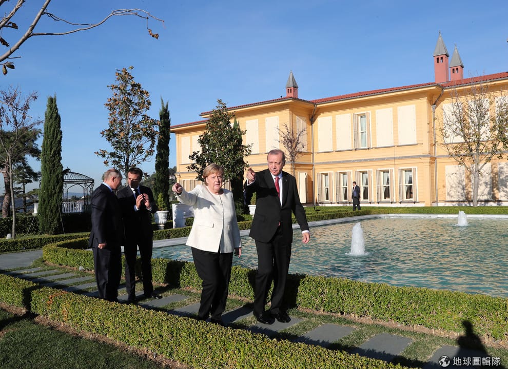 在伊斯坦堡的敘利亞高峰會上,與會元首由左到右分別是俄國總統普亭(Vladimir Putin)、法國總統馬克宏(Emmanuel Macron)、德國總理梅克爾(Angela Merkel)和土耳其總統埃爾多安(Tayyip Erdogan)。