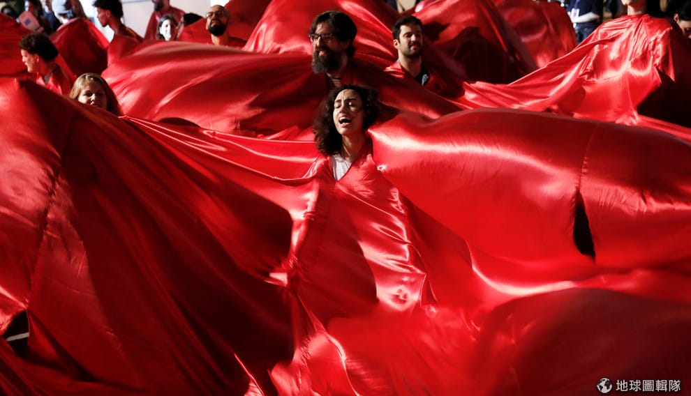 在聖保羅時裝周的尾聲,反對巴西右翼總統候選人波梭奈羅(Jair Bolsonaro)的民眾,披上鮮紅色的布料上街抗議。