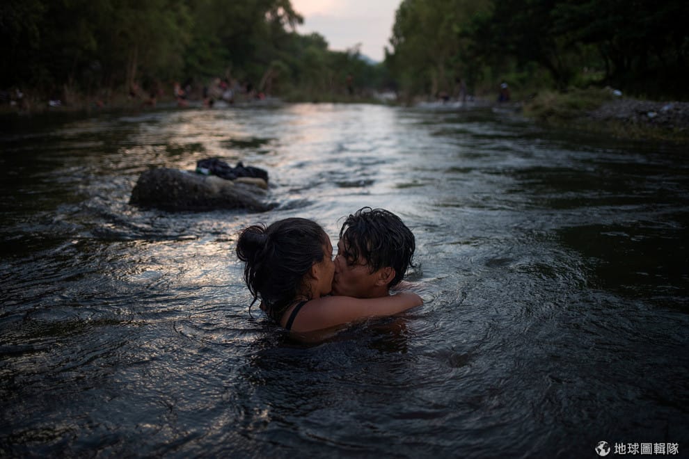 來自宏都拉斯的移民艾絲黛兒(Estelle,左)和以瑟列(Israel,右)在經過的河流裡戲水,他們沿著高速公路跟著「車隊移民」(Migrant Caravan)一塊往美國的方向前進,希望到美國申請庇護展開新生活。