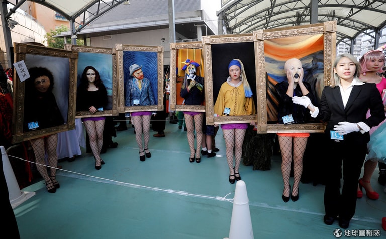 在東京舉辦的萬聖節大遊行上,參加者別出心裁扮成了世界名畫中的人物,有挪威表現主義畫家孟克(Edvard Munch)的鉅作《吶喊》(The Scream,右一)、17世紀荷蘭畫家維梅爾(Jan Vermeer)的《戴珍珠耳環的少女》(Girl with a Pearl Earring,右二)等名畫,至於最左邊那一張,你看得出來是哪幅「名畫」嗎?